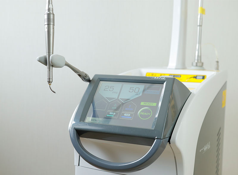エルビウムヤグレーザーは、歯を削ることを唯一認可されたレーザー治療器です。むし歯の感染部分だけを取り除くことができるため、健康な歯を多く残せるのが特徴です。