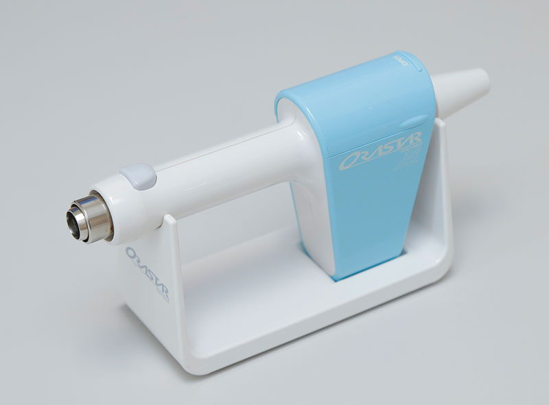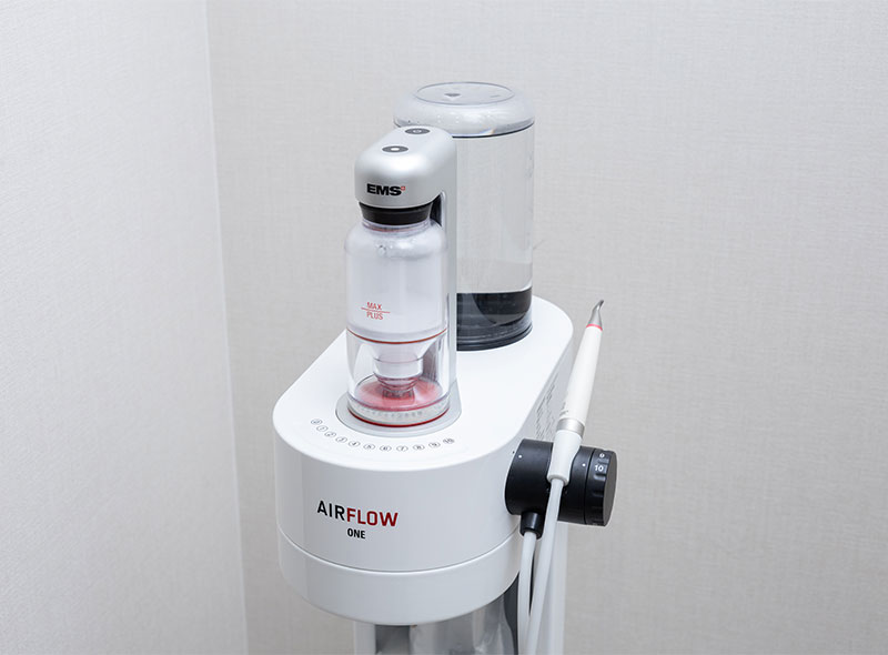 微細なパウダーと水、空気をジェット噴射することで、歯面の着色汚れやバイオフィルムを効率的に除去できる機器です。歯や歯周組織への負担が少なく、短時間で快適にクリーニングが行えます。予防ケアにも適しています。