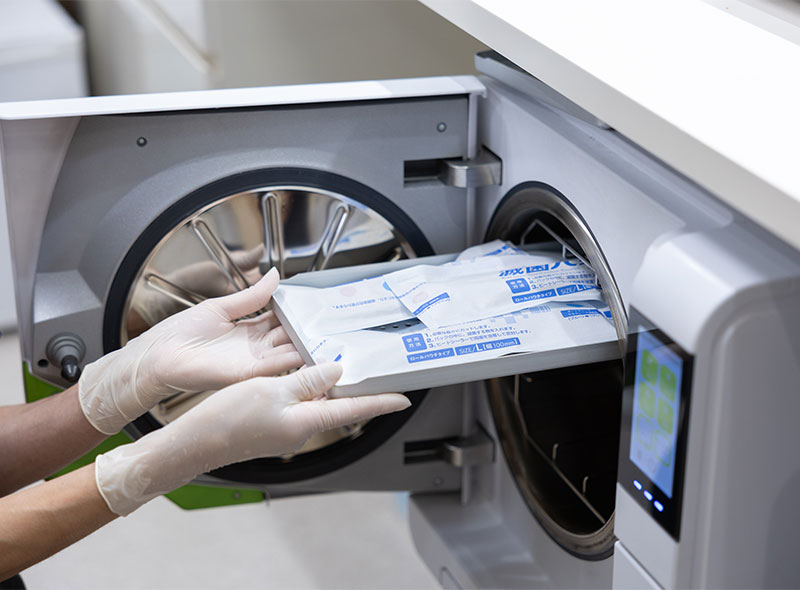患者さまの安全を第一に考え、当院では徹底した院内感染防止対策を実施しています。歯科治療器具は患者さまごとに交換または専用機器で洗浄・滅菌し、感染リスクを最小限に抑えています。また、十分な設備と機器を整え、感染防止研修を受けた常勤の歯科医師とスタッフが在籍しています。