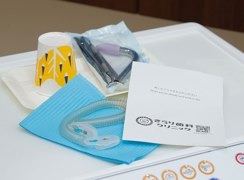 滅菌処理ができない紙コップ、エプロン、グローブ、トレーなどはディスポーザブル(使い捨て)製品を使用し、患者さまごとに常に新品に交換しています。