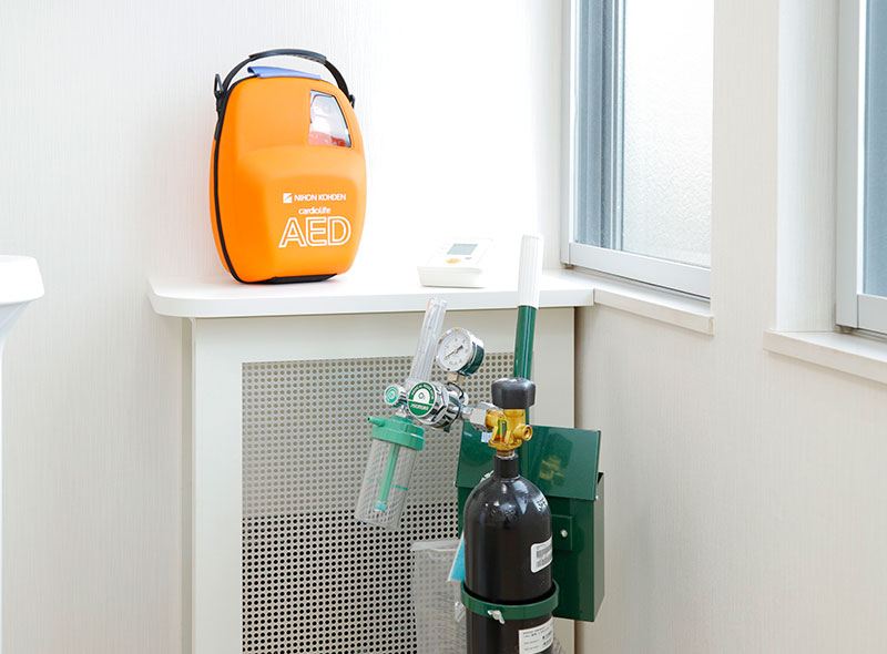 万が一の時に備え、AED、酸素ボンベ、血圧計、パルスオキシメーターを設置しております。