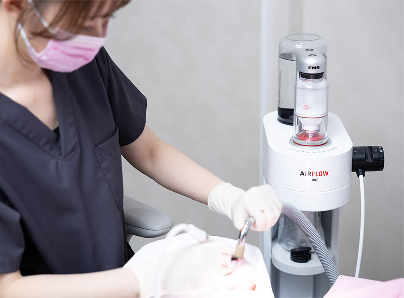 微細なパウダーを水と空気の力で噴射し、歯の表面を傷つけることなく汚れだけを取り除く清掃法です。使用するパウダーにはエリスリトールが含まれており、歯や歯ぐきに優しいのが特徴です。ジェット噴射の勢いで、歯間や歯周ポケットの奥、矯正装置の細かな隙間といった、通常の器具では届きにくい部分にまでパウダーが行き渡り、汚れをしっかり取り除きます。