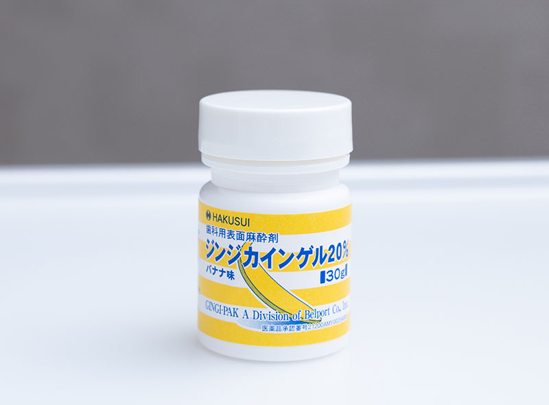 当院では、治療時の痛みや不安を和らげるために表面麻酔を取り入れています。「ジンジカインゲル」という麻酔を使用し、注射の前に歯ぐきや粘膜に塗布することで、針の刺入時の痛みを大幅に軽減します。